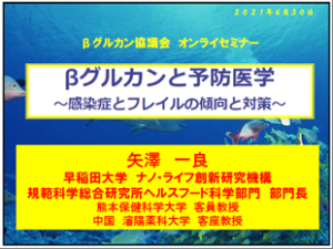 | 15:10 | 基調講演:βグルカンと予防医学 ~感染症とフレイルの対策~ | 早稲田大学 ナノ・ライフ創新研究機構 ヘルスフード科学部門 部門長 矢澤一良先生 |